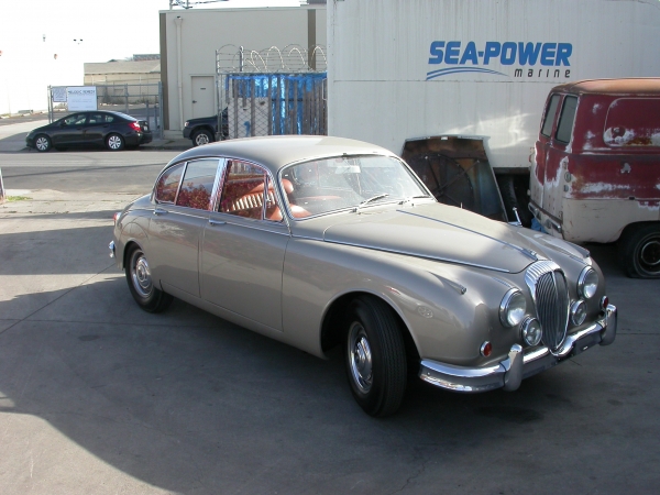 Here's one you won't see every day. A LHD drive Daimler V8 hemi created by jaguar after the acquisition of the Daimler motorcar company. The little 2.5 litre V8 could be found in Daimler's SP250 sports car commonly known in the UK and Europe as the Daimler dart. Upon acquiring the company Jaguar set about shoehorning the Daimler engine in the iconic Mk2 sports saloon known the world over for its twin overhead cam Le mans winning 6 cylinder power plant resulting in a more sedate non sporty gentleman cruiser. LHD examples of this model were produced in small numbers and few have survived the passage of time, the one we have here started life in Europe and made its way to California. The V8 fires off on the first try and runs great, original leather interior is in fantastic condition, all exterior chrome is perfect, the original interior wood has just the right amount of patina to look great without requiring restoration.